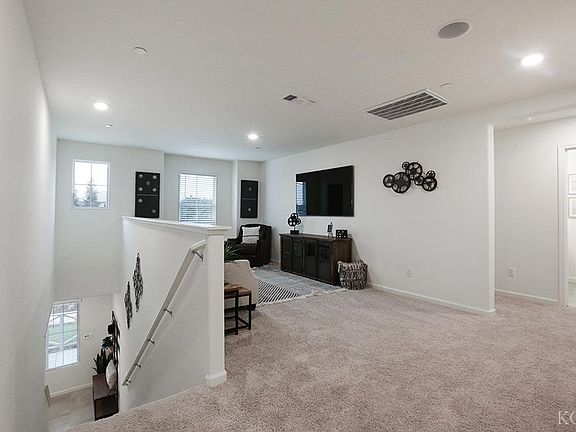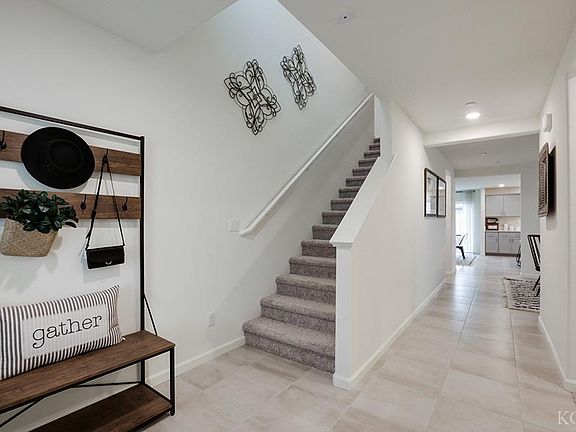 This spacious two-story, five bedroom, three bathroom home offers approximately 2,814 square feet of living space. A bedroom and a full bathroom are located on the first floor just off the entry. The open-concept living area opens to a large kitchen featuring shaker-style cabinetry with satin nickel pulls, quartz countertops, a walk-in pantry, a center island with snack bar, and Whirlpool® stainless-steel appliances including a range, microwave and dishwasher. The formal dining area is located adjacent to the kitchen. Upstairs is an open loft, the main suite and three additional bedrooms, as well as the indoor laundry room. The main suite has an adjoining bathroom with dual vanity sinks and a large walk-in closet.