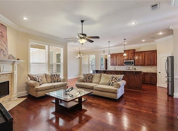 Oversized corner lot featuring open floor plan w/plenty of bells & whistles. Kitchen boasts granite counters & center island w/breakfast bar, stainless appliances. High ceilings, triple crown molding, wood floors. Master suite has a very large closet w/built ins, double sinks. Side load attached garage, rear yard access w/beautiful cypress double gated fence on sides and picket fence overlooking green space in back. Great school district.