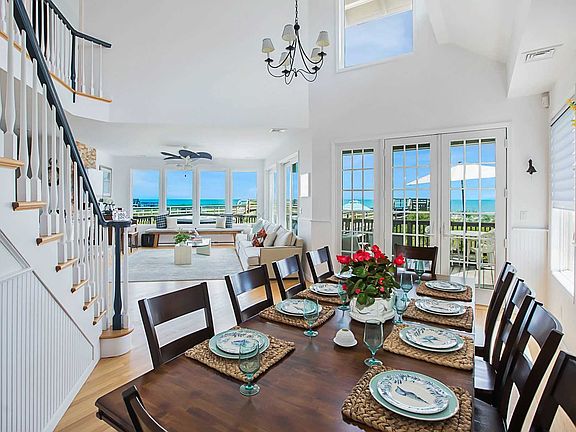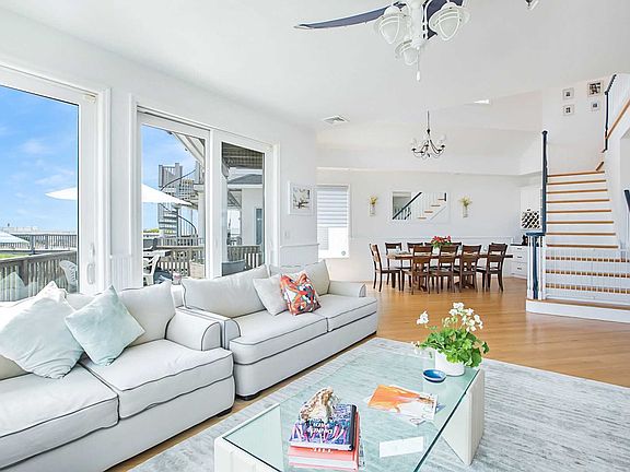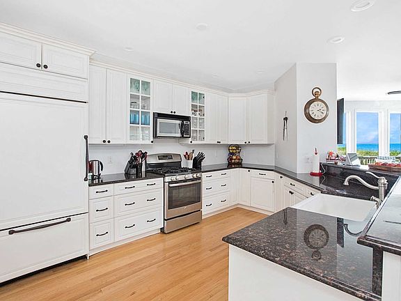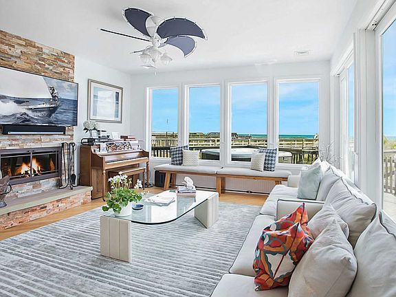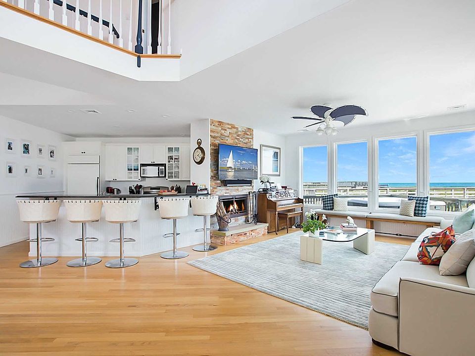 Don't miss this beautifully kept 4-bedroom contemporary Oceanfront home with stunning views from every level and right of way to the Bay. The first floor offers an open plan living room with wood-burning fireplace, showcasing a wall of sliding glass doors leading to the Oceanfront deck, hot tub and outdoor shower, a dining area with built-in wet bar, an island kitchen with granite countertops, Sub-Zero refrigerator and stainless steel appliances, an en suite bedroom with walk in closet, a separate cabana bathroom with outdoor deck access, and more. The second level has two wings - on one end, a master suite facing the Ocean, including wood-burning fireplace, privacy balcony and recently renovated master bathroom with steam shower; on the opposite wing sits two additional bedrooms and bath. Laundry on both floors. Fun game room and deck on ground level below first floor. Spacious driveway for all your entertaining needs. Beautiful detailing throughout. Room for plunge pool.