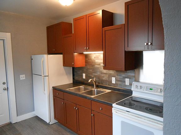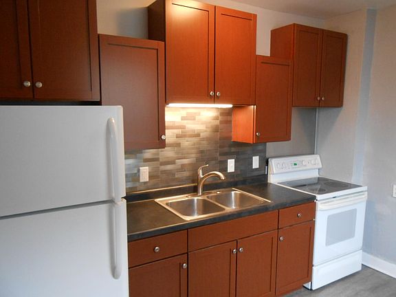 Brand new Kitchen Cabinets with SS backsplash and sink including stove and Refrigerator, Large dining room, Living room, with laundry room and half bath downstairs. Complete house fresh repainted 3 colors with high gloss white trim and doors. New Grey Oak Vinyl plank floors in kitchen and baths. 3 upstairs bedrooms and full bath. Full unfinished basement for storage. 7x7 vinyl shed and full privacy fenced back yard. Private off street parking in back Not on-line, only our office for applications. Application required for each adult. $25 fee. Need good rental history, 3x rent income. No evictions or felonies last 7yrs. No section 8 accepted. Tenant pays all utilities gas, electric, water. Pets Ok with additional deposit. $400 dogs $200 cats.