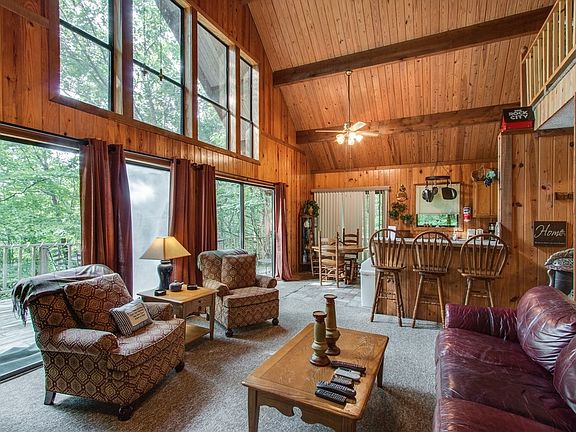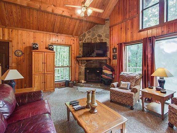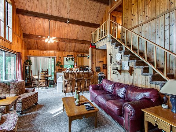Walk to the lake and boat ramp! Adorable rustic cabin in the woods with 3 bdr, 3 bth, 1742 sq ft, vaulted living room with fireplace, basement recreation room and ample deck space with hot tub for entertaining. Offered fully furnished.
