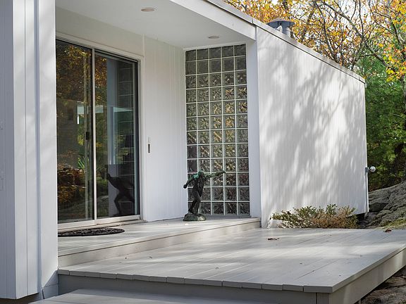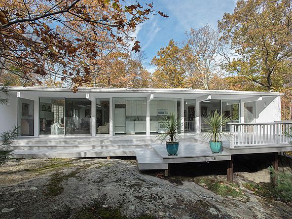 A star of New Canaan's Mid-Century Modernism, Lee House 1, designed by John Black Lee in the early 1950's lends itself to natural light and direct views of the moss-covered rocky site sitting above the terrain perched on a dramatic rock and surrounding deck. Relax with a book and a coffee or enjoy entertaining at its best. Cedar closet and expansive storage in garage. Set on 3 acres. Room for expansion.