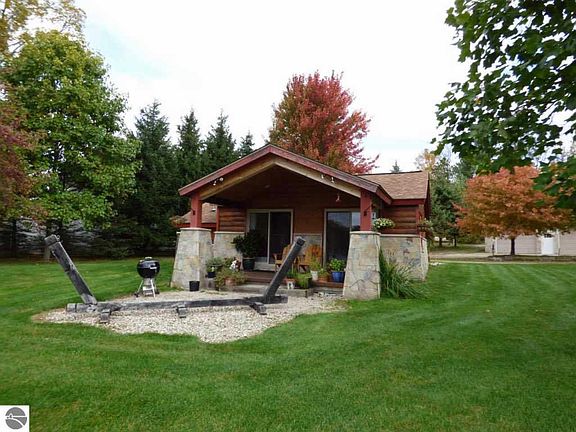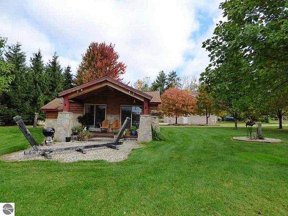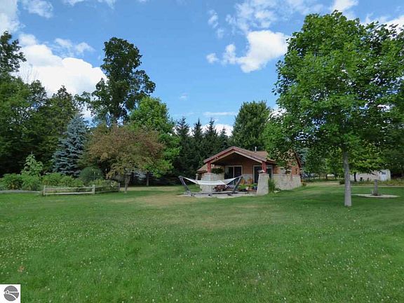 This is it! A charming, and updated, log and stone cottage on 270' of sandy Intermediate Lake frontage. Enjoy some of the best swimming on the lake, and a few great fishing holes right out front! With an estate-sized parcel of over 3 acres, you have plenty of space to expand, entertain, or merely to enjoy the privacy it affords. The cabin offers wood floors, island kitchen, great room with natural stone fireplace, along with 2 main floor bedrooms, a sleeping loft and bath. From either bedroom, you'll awaken to lovely lake views. A full-length covered deck on the lake side is where you will likely start your days. You will especially want to end your evenings enjoying the sunset. A 1200 square foot carriage house, with 3+ stall garage, also enjoys commanding lake views and awaits the final design of your choice. The dramatic ceilings in the carriage house will be absolutely stunning when the space is completed. You can transform this into your main living area, or keep it as guest quarters while you enjoy the main cottage. Imagine building your dream lake house, with the cabin and carriage houses as guest space. Enjoy evenings around the fire ring, at the beach or cooking by the deck. This parcel offers so many options. A trickling stream meanders through the trees, crosses under the winding drive, and runs alongside the property. What a wonderful landscape feature it is. There are apple, cherry and apricot trees on the property as well. The cabin is well-insulated, can be heated with wood, and the septic system was updated with a new pump in 2016. Located near year-round recreation, with nearby golf and ski resorts, Glacial Hills Trails, and Lake Michigan, and charming Up North villages, this home will bring many years of enjoyment and memories. Just imagine the wonderful times you will enjoy at the lake!