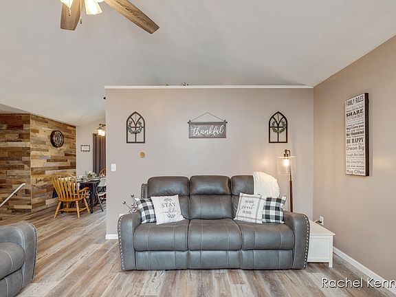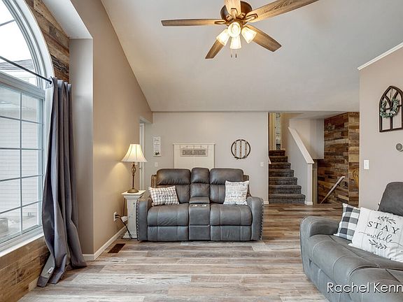 Welcome to this beautiful 4 bedroom and 2 full bath home in the city of Belding, which is close to schools, trails, parks, downtown, the Flat River and much more. Step into the updated entry with a spacious family room, luxury vinyl plank and vaulted ceilings. The gourmet kitchen features quartz countertops, stainless steel appliances and a well appointed dining room. With newer carpet throughout, upstairs there are two large bedrooms and a full bathroom. The daylight level features a full bathroom and two additional bedrooms, one with a large walk in closet. This spacious home also offers a large basement that could be used for a rec room, gym, office, etc... This home boasts a serene half acre lot with a mature wooded backyard, oversized 24 X 24 deck outdoor shed, fire pit with bench and horseshoe pit, perfect for entertaining. The possibilities are endless with this move in ready home.