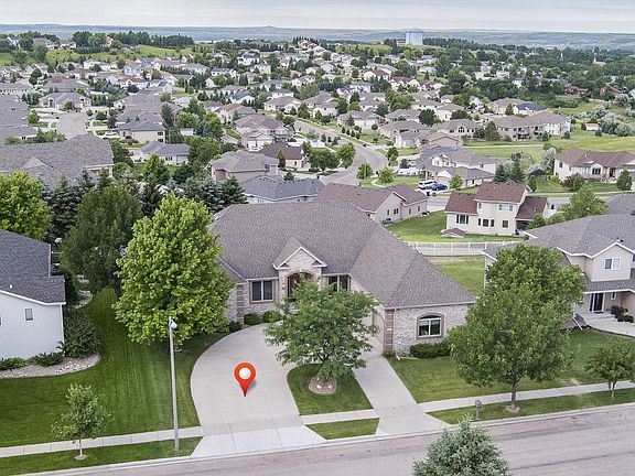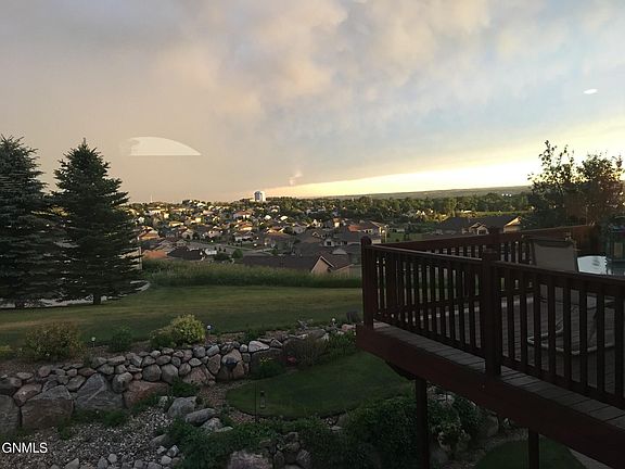 Do you want AMAZING VIEWS and SUNSETS that you can see for miles and miles? You must check out this stunning custom built one owner RANCH STYLE home with a WALK-OUT LOWER LEVEL located in a quiet cul-de-sac in a very desirable area in NW Bismarck. The exterior is maintenance free with BRICK and STEEL SIDING. Upon arriving you will notice all the many EXTRAS and CUSTOM QUALITY features that add value and pleasure living in this wonderful home. There are 4 bedrooms and 3 bathrooms. The spacious primary bedroom is the perfect retreat with awesome VIEWS, huge walk-in closet, convenient access to the MAIN LEVEL laundry room including the washer and dryer plus built-in ironing board cabinet, double vanities with a makeup counter, big custom tile shower and separate jetted bathtub and HEATED tile floors. The attached TV is included. The main floor office will knock your socks off with all the extra custom cherry woodwork, built-in desk areas and unique SOLID CHERRY COFFERED CEILING design and solid french doors. The attached TV is also included. The living room boasts TALL CEILINGS with CROWN MOLDING and ROPE LIGHTING, big tall windows showing off the wonderful VIEWS, a gas fireplace surrounded by stone and custom built-in cherry bookcases. There is MAPLE hardwood flooring on most of the main level areas excluding the primary bedroom and bathrooms. The large kitchen features stainless steel appliances, CHERRY CABINETS with soft close features and pull-outs, granite countertops and a walk-in pantry. There are 2 dining areas: formal and informal...lots of room for entertaining! The informal dining area has a patio door that provides access to the deck and the FANTASTIC VIEWS. The formal dining is very spacious and has room for extra buffets, china hutch and a large table and chairs. The half bath is convenient to the kitchen area and the garage. The lower level WALK-OUT leads to a brick paver patio that provides privacy. There is a very spacious family room which has a gas fireplace with stone and above ground windows. There is also a spacious rec room big enough for a pool table plus a large CUSTOM WET BAR that will hold 8 or more bar stools for entertaining. The bar fridge is also included. (Buyer has an option to purchase the pool table). There are 3 bedrooms, one with a walk-in closet, in the lower level and a full bathroom. Another bonus is the HUGE STORAGE ROOM for all your holiday decorations and valuables. This space also includes a utility sink with hot/cold water. There are MOTORIZED CUSTOM BLINDS on the staircase leading to the lower walk-out level. This home is also wired for a sound system in the Great Room/Living room, Primary Bathroom, Deck and Lower Level. The HEATED garage has an extended work area including a utility sink with hot/cold water and 2 floor drains plus large attic storage above the garage with ladder access. The landscaping is fabulous with numerous rock formations. There is an awesome water feature pond in the backyard and a sprinkler system throughout the entire yard. Call today to see your dream home !!