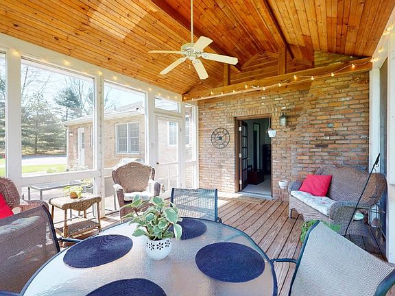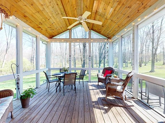 Relax in this tasteful country home with beautiful 6.2 acre property and screened-in porch. Stocked fishing pond and canoe, 3-acre meadow with walking path, vineyard with shed, 9-hole disc golf, perennial herb garden, butterfly and vegetable garden, playset, basketball hoop and huge bonfire area! Truly a playground for adults and children. Updates include renovated kitchen, new HVAC and radon mitigation system. Enjoy nature views from every room and explore everything this property offers!