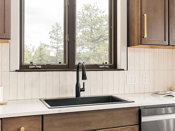 Welcome to your Evergreen escape, an impeccably renovated mountainside retreat, where stunning National Forest & mountain views greet you from every room. Inside you're immediately drawn into the expansive main level, where soaring ceilings & walls of windows flood the space with natural light & frame the breathtaking scenery outside. The open-concept living room, kitchen, and cozy sitting nook create the perfect setting for relaxing or entertaining, with warm oak hardwoods underfoot & skylights above enhancing the light, airy feel. The beautifully refreshed kitchen is both stylish & functional, featuring plentiful cabinetry to keep you organized, a spacious walk-in pantry, quartz countertops, designer tile backsplash, upgraded lighting, & a striking oversized waterfall island with breakfast bar. It’s the heart of the home & seamlessly connects to the generous multi-level deck—ideal for sunset dinners, stargazing in the included hot tub, or simply soaking in the peaceful, tree-lined surroundings. Head down one level to a living room centered around a cast iron wood-burning fireplace. This level also includes a private bed & bath, offering flexibility for guests or a home office. Upstairs, you’ll find two bright secondary beds & an updated hall bath with modern finishes. At the end of the hall, the primary suite is a true sanctuary. Vaulted ceilings, panoramic mountain views, & a large walk-in closet set the tone, while the spa-like ensuite bath features dual sinks, an oversized walk-in shower with gorgeous tile selections, & thoughtful updates that bring comfort & luxury together. Additional features include all-new lighting, smart home automation, a whole house fan, high-speed internet, new carpet in the lower level, & an oversized heated garage with 220V outlets, built-in workspace, Tesla charger, & a custom dog wash station. Situated on a south-facing .85-acre lot, this property is close to hiking trails & is just 10 mins from Historic Downtown Evergreen.