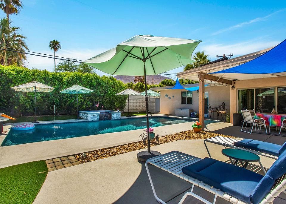 Location, Location, Location.. Stunning View! Mid Century Lovers!!!! Prime SOUTH- Facing Backyard w/ mountain views! Backyard is a paradise, with a super-size sparkling Pool & spa Pebble-Tech & Sundeck built in, waterfall, fountain just stunning.... Astroturf Putting green, gorgeous landscaping, fruit trees, palm trees, surround sound, Outdoor TV.. We call this your own Oasis an Entertainers Dream, Very Private. Huge open great room floor plan concept. WOW! . This beautiful Oasis features walls of glass windows in the living room. Remodeled and ready for your enjoyment! Nicely re-done, new kitchen appliances. With a premium half circular driveway with TONS of parking to finish off this Mid Century Dream!! The Home has Solar. Excellent Investment! Air BNB,s are in demand in Palm Desert! There is So much to mention about this beauty it is a must see. Call today and start living the good life!