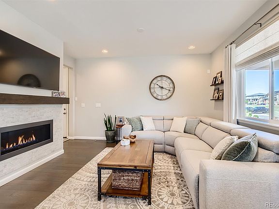 Welcome home to Serenity Ridge, a low maintenance neighborhood with all homes built around an inviting central park! This charming smart home provides a covered front porch that gives the Nixon plan abundant curb appeal. On the main floor of this paired home, you'll find an open dining room and a spacious kitchen with a roomy pantry and center island, perfect for gatherings. The kitchen comes complete with stainless steel appliances, including fitted fridge, gas cooktop, double ovens, maple cabinets (with a smoke finish) and granite countertops. Also on the main floor enjoy and an inviting great room with fireplace, upgraded hardwood flooring, and convenient mudroom and powder room. Upstairs, discover convenient laundry and three generous bedrooms, including a relaxing primary suite with an attached bath, double vanity, and granite countertops, along with an immense walk-in closet. Also included with this home is a finished basement that features an additional bathroom and rec room for the family. Conveniently located one half mile to Cherokee Trail High School and Fox Ridge Middle School (Cherry Creek Schools) walking trails, and bike paths with easy access to Aurora Reservoir 2 miles to Southlands Mall and E-470 9. Easy access to DTC this will not be one to miss! Sellers to provide a one year home warranty