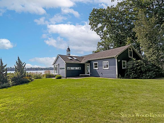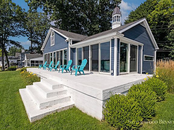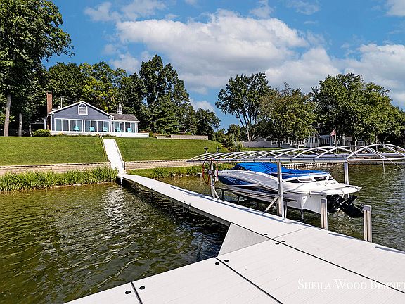 Located on the west shore, the massive lot features 95' of lake frontage. The large lot across the street with 3 stalls of garages with great possibilities. The beautifully landscaped lot is one of the largest on the lake, and is shaded by large mature hardwood trees. This rare property includes an outdoor built in spool (spa/pool) and patio along with a built-in natural gas BBQ grill with a custom stonework surround. This property and the view as you walk in the front door will stop you in your tracks! The condition of the interior will allow its new owner to make it their own. The main floor has the primary bedroom and large bath, main floor laundry room, office, large great room with fireplace, and huge kitchen, with amazing views of all of Bostwick Lake. Upstairs has two adorable