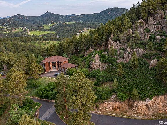 LOCATION WITH PERFECT VIEWS makes this a RARE find! Custom 5 bed 5 bath home nestled on top of the hill with amazing 360 degree views of Mt. Evans, surrounding mountain, valley and rock outcroppings. Wrapped by Aspen, Pine, Fir and heavy vegetation for your privacy and mountain air. Master has mountain and valley views which you can enjoy from your bed or large soaking tub. Gourmet kitchen has 2 separate gas ovens with cooktop and granite counters. Large island is surrounded by windows with mountain views. This home has the perfect design with separated rooms for privacy and huge entertaining areas inside and out. Oversized 3 car garage with extra height perfect for all your toys and car lifts. Two decks and a stone patio, even the front patio boats of Colorful Colorado! $33,000 in outdoor landscape lighting plus high impact hail resistant shingles. Set up your private showing today. You'll want to experience this home, a true gem, your mountain sanctuary is waiting.