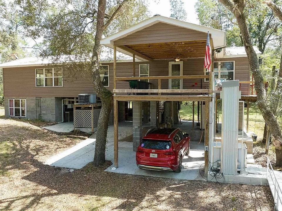 Escape to Your Tranquil Oasis! Nestled amidst the serene beauty of nature, this riverfront property offers a harmonious blend of relaxation and outdoor adventure. Step inside to discover new drywall and fresh paint, creating a welcoming ambiance. The open kitchen, complete with stainless steel appliances (including a built-in wine cooler) and a spacious island, is an entertainer’s delight. The expansive great room boasts hardwood floors and abundant natural light, courtesy of large windows that frame picturesque views. Granite countertops and tile flooring enhance the updated bathroom. Multiple decks beckon you outdoors, providing ample space for lounging, dining, and hosting gatherings. Beneath the home, an elevator and covered parking await, along with two versatile storage or craft rooms. Additional features include a tankless water heater, water softener, and a variety of fruit trees. Whether relaxing by the nearby sandbar or launching your boat at Gibson Park, this property invites you to savor the tranquility of riverfront living. Originally a singlewide MH, it now boasts a beautiful addition that elevates its charm and functionality. (Note: Gate at 68th Drive Requires Code, Agent Needs to be Present)