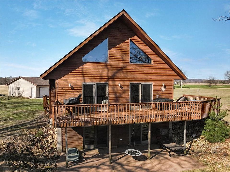 Quiet, secluded 4 bedroom 2 bath home on 6 acres with great 30 x 40 garage/workshop. Home's interior has been extensively remodeled and updated, has a full, mostly finished walkout basement. Main floor has newer kitchen, all new floors, mostly new mechanicals, main floor laundry and walkout to a deck overlooking the pond. Basement recently finished, has nice bathroom, large bedroom and a great family room that has a walkout to the backyard. Garage is excellent, yard on top could have gardens, play areas, farm animals, etc. Over the bank and into the woods is a sweet pond, wildlife stand, mature hardwoods that back up to a large woodlot and close to the Eau Galle River. Great property!!