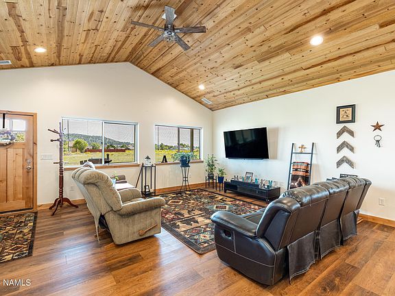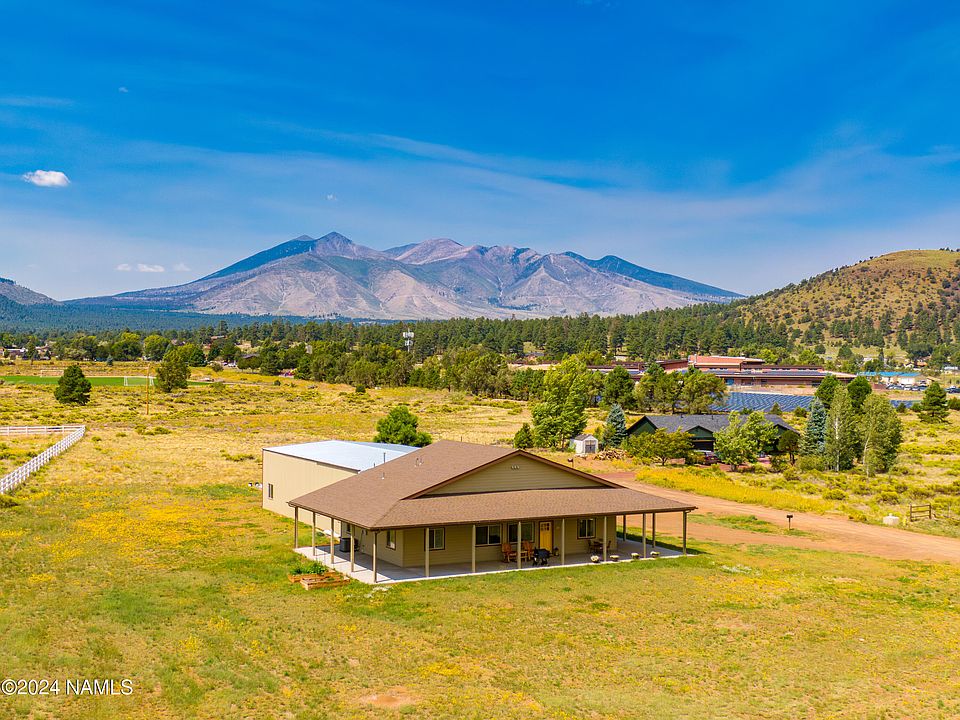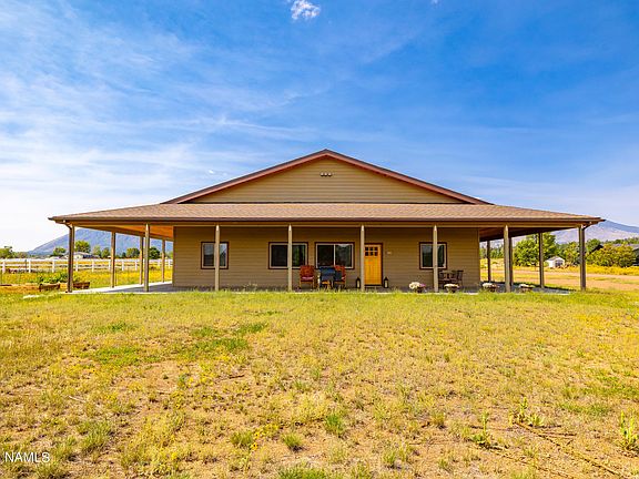 Perfect Country Retreat with Ample Garage & Shop Space. This 3-year-old home on 2.5 acres offers the ideal blend of space, comfort, and scenic beauty. Boasting breathtaking views of the San Francisco Peaks, this 3-bedroom, 2-bath, 1600 sq ft home features a split floor plan and is beautifully appointed with high-end flooring and cabinetry. The open-concept great room seamlessly connects the kitchen and living area for easy entertaining. A remarkable 3000 sq ft garage, with space for 8+ vehicles, includes 4 roll-up doors—one with RV height—and a bonus 3/4 bathroom. Located on a quiet country road just minutes from Flagstaff, this property has room to grow and enjoy!