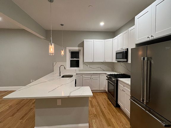 Closest trains = East Somerville (Green Line) and Sullivan Square (Orange Line) 2 bed/2 bath (first floor, left-side) Modern eat-in-kitchen with new stainless-steel appliances Newly tiled bathrooms Refinished hardwood floors throughout New central heating and AC w/ NEST thermostat Gorgeous white-granite counters In-unit laundry (new washer/dryer machines) Spacious living room High ceilings Stunning Master bedroom with two walk-in closets Street parking with City permit
