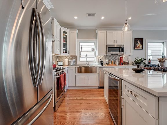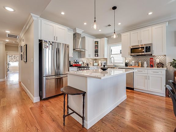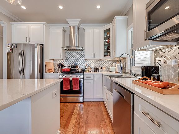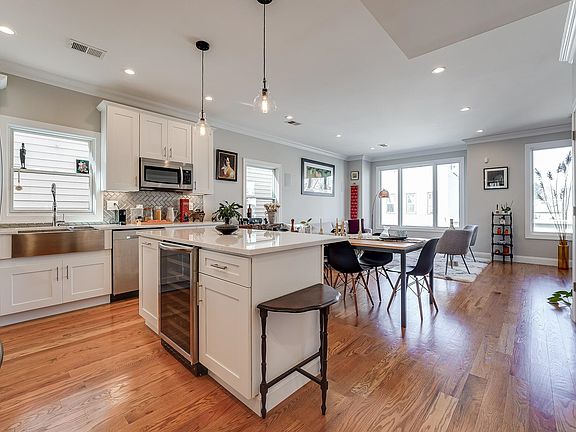 Upgrade your every day with elegance in this three bed, two bath with private roofdeck and garage in Jersey City Heights. Beautifully constructed in 2018, classic design incorporates crown molding, 4.25” hardwood floors, recess and stylish pendant lighting, plus large Pella windows on three sides of the home allowing for loads of natural light. State-of-the-art amenities include surround sound in the living room, outdoor speakers on the rooftop, keyless Schlage entry, security camera and video intercom, plus Tesla EV car charger in tandem garage. Open concept eat-in kitchen showcases white quartz counters, herringbone backsplash, shaker cabinets with glass display accents, stainless appliances including hood, and timeless farm sink. Head up to the serenading full-floor private rooftop complete with built-in shade umbrella and 360 cityscape views. Spa-inspired bathrooms boast features like floor to ceiling tile with beautiful black hexagonal tile accents, glass shower with cutout niche or spacious soaker tub and polished chrome multi system fixtures. Settled on tree-lined street in the heart of The Heights, this home offers direct access to beautiful Washington Park with playgrounds, track fields, baseball fields, and tennis courts, both Central Ave and Summit Ave with excellent shops and restaurants, and the 9th street elevator to Hoboken, Lightrail or PATH. Jersey City Heights is known for its artistic vibe, excellent community, great schools, parks and easy NYC access.