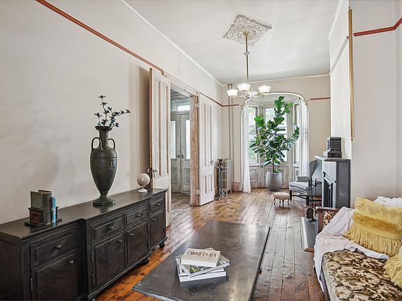 Transport yourself to a bygone era in this 1890s pre-war gem located in The Heights, Jersey City. Refurbished, Victorian multi-family residence offers 3 bedrooms + den, 2 full baths and backyard. You could live in one unit while collecting rent in the other or simply occupy this unique home for just you and your family. Admire plaster medallions and crown moldings, ornate arches, porcelain door knobs, restored pinewood floors to their former glory, six original wood-burning fireplaces, while meticulously restored original gas lamps in copper, aluminum and brass, cast a warm glow, rewired for modern convenience throughout. A Juliette balcony accompanies the kitchen boasting custom maplewood cabinetry in a classic milk paint finish and solid brass hardware. Ascend the original staircase to find double maple wood front doors leading to a primary and secondary reasonably sized bedroom and a den that could be easily occupied for a home office or nursery. Enjoy easy access to new parks, schools, shops, and transportation. Don't miss this chance to own a piece of history with modern comforts.
