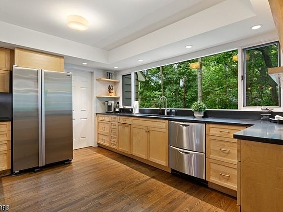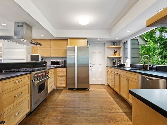 Modern Mid-Century Col located on quiet cul de sac in Up Mtc. Enjoy beautiful property from deck overlooking Yantacaw Brook Park or chic garden patio showcasing lovely perennial garden in front. Renovated open concept gem features sun drenched LR w gas fireplace & glass door access to mahogany deck over looking the park. Stylish kitchen has SS appliances including Wolf range, open shelving, honed black granite & huge window w park views. 1st Flr Powder! Sliding doors in DR reveal discreet work space & storage. Upstairs are 3 spacious BRs including one w BA featuring Carrara marble, hall BA & hall walk-in closet. Walk-out lower level offers large FR & work space with built-in storage & plenty of natural light. Also laundry room w storage space & access to LL patio. Close to 3 Parks! Bus to NYC at corner.