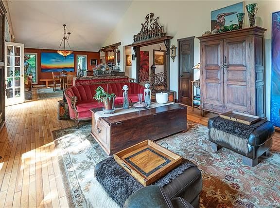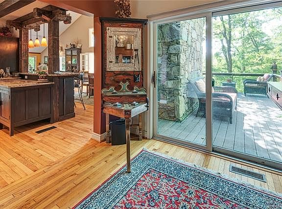 A magical oasis just 6miles from downtown Asheville! With long-range views under a canopy of trees - adjacent to and protected by the Blue Ridge Pkwy (walk to the Mtns 2 Sea Trail) - this is a must see! Sellers artistic flair and exceptional details inside and out: doors, cabinetry, shelving, trim, metalwork. Floor plan is open and bright with hardwood floors, big windows and massive master bedroom on the main complete with its own sitting area built-in bookshelves and private back porch. Love wine? Host your own tasting by the spectacular wine cellar then gather by stone hearth wood-burning fireplace. Just outside city limits so county taxes only also HOA permits homestays/short term rentals - see attached amended restrictions. Three car attached garage with workshop space too!
