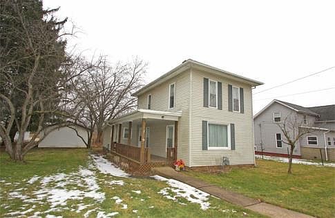 2 Story home that features 3 bedrooms and 2 full baths, large living room with wood flooring, adjoining cabinet filled kitchen with easy care vinyl flooring, dining area off kitchen and living room, first floor master bedroom, relaxing covered front porch and enclosed back porch, natural gas heating and central air conditioning, detached 2 car garage plus on street parking, vinyl sided exterior, situated on an easy to care for level lot, quick possession available, won't last long at $55,000. VIRTUAL TOUR