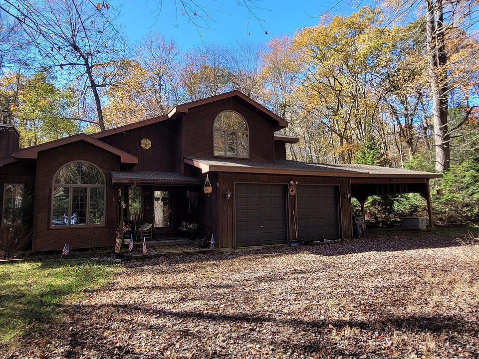 Feel surrounded by NATURE in this spacious contemporary style home in Holiday Pocono! This home backs up to the Hickory Run State Park, avid hunters look no further! Walk inside to a large living room with tall ceilings and plenty of natural light from all the ANDERSEN windows. There are TWO FIREPLACES, one n the family room and the other located in the sitting room off the kitchen. Talk about WARMTH! This house has 3 generous sized bedrooms all located upstairs and 3 full bathrooms. The kitchen has an adorable peak through window into the dining room. The laundry room is right off the kitchen by the garage entrance. The primary bedroom has VAULTED CEILINGS, double closets, and en-suite bathroom! The house has recently had a NEW ROOF put on, NEW CARPET, and FRESH PAINT. There is a smaller storage room upstairs or home office, the choice is yours! If you enjoy your toys, atvs, tools, or etc there is a two car attached garage along with the huge COVERED CARPORT attached to the house. Even though you are out in the woods and winters can be cold, ice, or windy you will feel care free with a WHOLE HOUSE GENERATOR just in case! If you want more land, there are adjoining lots that can be sold separately. Schedule a tour today before it's too late! This house is waiting a new home owner to make it their own.