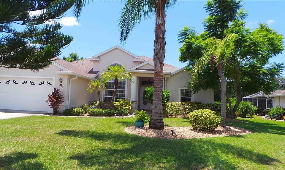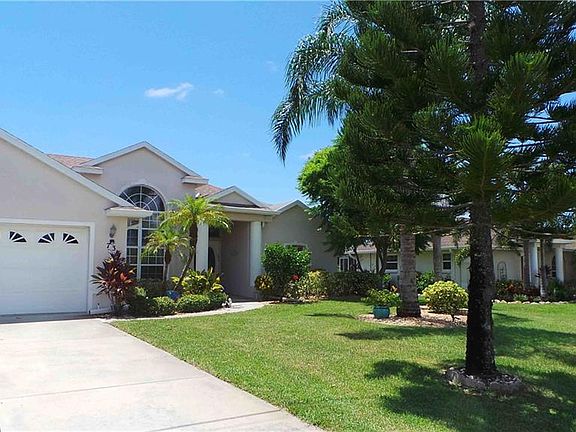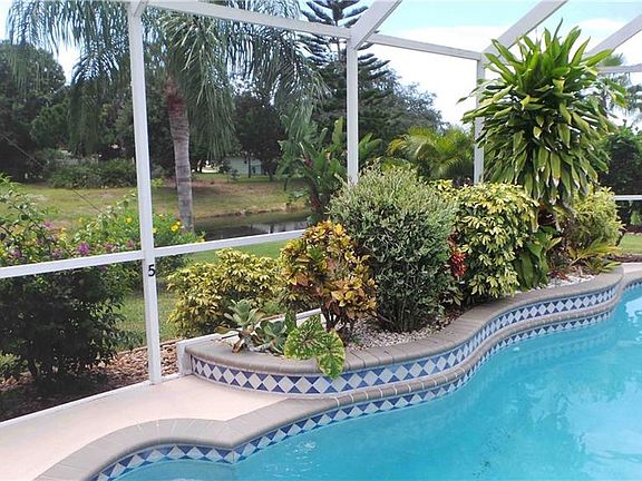 Waterfront attractive turn-key furnished 3 bedroom 2.5 bath pool home in ready to go condition. Ideal property for snowbirds, rentals, or both. House is currently being used as seasonal rental and has booking into 2020. When you enter through the double doors you have a delightful pool and canal view. The home is tiled throughout with carpet in the bedrooms. The inside repainted in 2017. Bright and light, open floor plan, high tray and cathedral ceilings make it even more spacious, tastefully decorated and furnished, built in plan shelves, Corian counters in the kitchen, large aquarium window in the wide eating area and soaring ceiling in the great room. A quiet reading/den area has been created at the front of the property which could also be used for a formal dining room. The large master suite has double vanities, separate soaking tub and shower. Outside the heated pool (electric heat pump 2014) has a perfect SW exposure, large tiled lanai, 1/2 bath and outside shower. Flower bed plants with sprinkler system; mature landscaping with queen palms, pygmy palms, Jacaranda, lot of flowers... HVAC replaced in 2015, new microwave in 2017, disposal in 2008, roof inspection 2017... The house is well maintained. For investors this is a great investments property with good rental history (more than $25k gross revenue this year!) We have booking through 2019 ($24K) and 2020 ($17k) Tenants just love this Floridian well located property!!! Call agent for details...