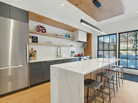The primary unit welcomes you with an open-concept first floor, featuring a sunlit living and dining area and a gourmet kitchen outfitted with Miele appliances, quartz countertops, and custom cabinetry. On the second floor, you'll find a stylishly appointed guest bedroom and bathroom. The third floor is home to a luxurious primary suite with and generous closet space, along with an additional bedroom that's perfect for family or guests, and a dedicated home office.