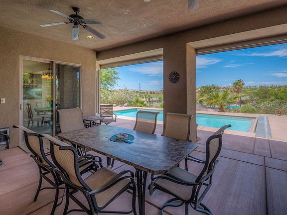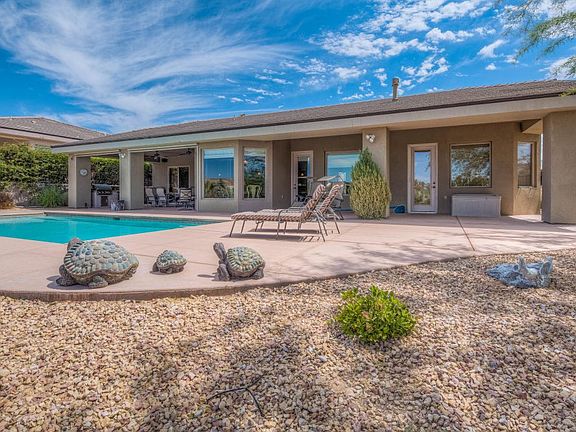 This exceptional custom home is located in Fox Hollow, an exclusive gated community surrounded by the Oasis and Canyons Golf Courses. Situated on over a half an acre, this desert retreat offers everything under the sun. From this elevated and very private home site, enjoy panoramic southwest views of the Oasis Fairways, Virgin mountains and Flat Top Mesa. The yard is lush and beautifully landscaped with numerous large trees and low maintenance shrubs. The courtyard is spacious providing additional outdoor space. The back yard has 2 covered patios, an awesome swimming pool and outdoor kitchen. The floor plan is desirable and bright. Large picture windows line the walls bringing the outdoors in. The fireplace in the great room adds ambiance and the kitchen is exceptional with high end granite, cabinets, stainless appliances and a walk-in pantry. The master suite and bathroom are exquisite. The extended garage is 540/SF and has custom cabinets and an Epoxy finish. No expense was spared.