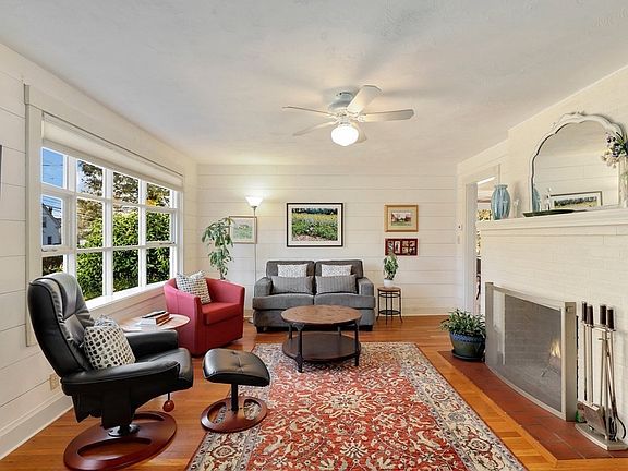Warm and inviting describes this lovely 2/3 Bedroom, 1 full bath Ranch featuring 2 car detached garage with separate storage room. This home has been lovingly maintained and updated by current owner. Completely renovated full Bath w/walk-in shower, gorgeous tile work, radiant heated floor. New ceilings throughout most rooms plus ceiling fans, new, efficient heat pump water heater, new appliances. Hardwoods throughout, this home features 2 fireplaces, Den/3rd Bedroom, central air, forced heat. Kitchen w/Corian, and updated appliances, Dining Room flows into the sun splashed fireside Living Room. The Den/3rd Bedroom w/fireplace is perfect for in-home office/reading room or 3rd Bedroom (no closet). Primary Bedroom w/new closet built-in shelving, Guest Bedroom w/new closet built-in shelving, main level laundry. The sunporch offers commanding views of the level backyard space w/patio for outdoor entertaining. Close proximity to schools, town center, sidewalked streets!