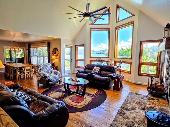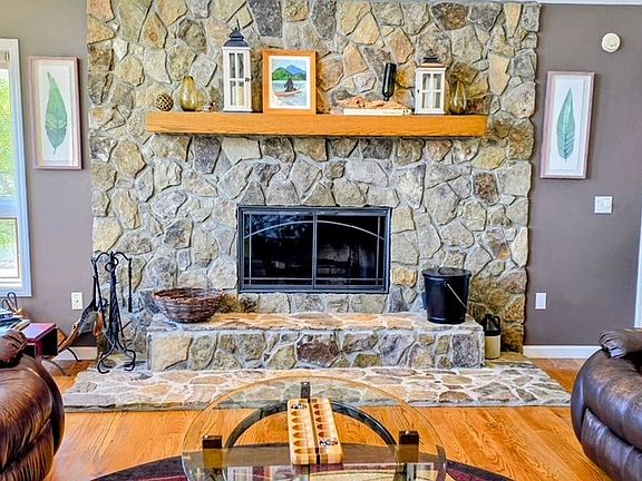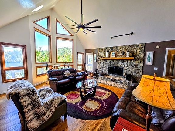 Experience the ultimate lakeside living in this beautiful three-story home, perfectly situated with breathtaking views of Lake Santeetlah. This residence has plenty of space for the whole family! The open-concept design on the main level seamlessly connects the kitchen, dining, and living area, creating an ideal space for entertaining and family time. Plenty of windows to enjoy the views from inside! 16- foot ceilings and a beautiful fieldstone wood-burning fireplace in living room. Step outside onto the deck to savor the fresh mountain air while taking in gorgeous views. Main level also features the laundry room and primary bedroom which is complete with a private en suite bathroom and a generous walk-in closet for your convenience. Descend to the second level where you'll find two additional bedrooms, each with their own en suite bathrooms, and a second living room. The lower level is a true entertainment haven, boasting a bunk room, game room, and an additional bathroom, ensuring ample space for family and friends to enjoy. Don't miss your chance to own this remarkable lakefront home. Home does very well as a vacation rental.