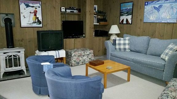 Bring your friends and family and let the fun begin. 4 bedrooms, 3 baths, 2 kitchen areas, sunshine fills the living area which is warmed by a huge stone fireplace. Walk out to a lovely back yard area and enjoy a winter view. Minutes to Mt. Cranmore or a short walk to North Conway village for morning coffee or shopping. A great entry with built in's organize skis and supplies for fun. A bedroom and bath on each level insures everyone relaxes in comfort.