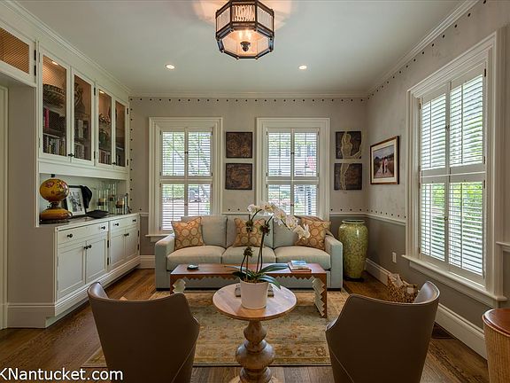 Own a piece of Nantucket history with the Elizabeth Starbuck Barney House, an elegant Victorian mansion, circa 1873 meticulously renovated in 2014. Located on beautiful, tree-lined Main Street, just steps from the center of town, this unique property also know as the 'Blue Victorian' features a 4 bedroom 41/2 bath light-filled home, expansive gardens with an outdoor terrace surrounded by mature landscaping and decorative fencing for privacy, and a large cupola with peek-a-boo views of Nantucket harbor. This sophisticated home was lovingly redecorated, modernizing it with the finest custom finishes and stunning interior furnishings by acclaimed Nantucket designer, Audrey Sterk, while preserving its original features. The one-of-kind property offers the perfect in town oasis for the discerning buyer who appreciates modern luxury combined with the romantic beauty of the of the Victorian era.
