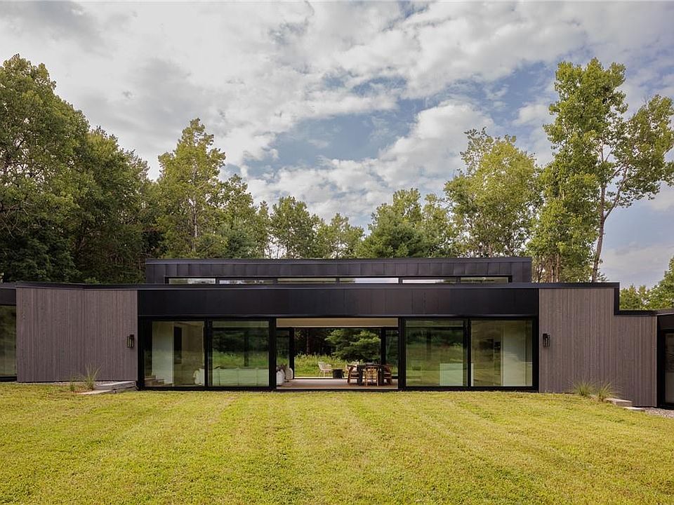 Located down a private winding drive The Passive House is an architect-designed modern home set amidst 15.7 wooded and pastoral acres. The home was designed and constructed to attain passive house certification ensuring a rigorous level of energy efficiency (pending certification by the Passive House Institute US (PHIUS)). Conceived as a fossil-fuel free, all-electric home, solar panels work to bring this house close to net-zero. An ERV (Energy Recovery Ventilator) system is built into the HVAC, ensuring that fresh, clean air is circulating throughout every room at all times. The home is positioned to capture southern light and distant views. A bright, welcoming foyer leads to the first wing, which includes a bedroom, office space, full bathroom, and mechanical room. Steps lead past a powder room into the heart of the home — a spacious, open-concept kitchen / dining / living area featuring 13-foot ceilings and floor-to-ceiling sliding doors that frame bucolic meadows and Catamount Mountain views. Beyond the living room, the west wing of the home has a media room/second living room, and a hall that leads to the additional two bedrooms, a second full bath, and the primary bedroom with ensuite bathroom. All bedrooms feature high quality triple glazed windows and doors. Enjoy indoor spaces that flow easily to the outdoor spaces creating a beautiful modern aesthetic blending seamlessly with nature. A 3-car garage — pre-wired for EV charging — and back bluestone patio complete this offering. Located in Hillsdale just minutes from the hamlet, 15 min to Great Barrington, and under 30 min to both Hudson and Millerton. Additional Information: ParkingFeatures:3 Car Attached,