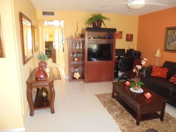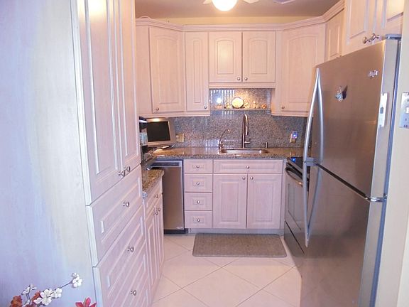 Absolutely gorgeous & immaculate apt. Renovated kitchen with granite & stainless steel appliances. Unit totally tiled with large white tile. Bathrooms are renovated with a beautiful stall shower. Tiled patio with shutters looking out at a terrific water view. A/C & hot water heater replaced 2015. Custom closets thru-out. Please note that Century Village is a 55+ verified community.