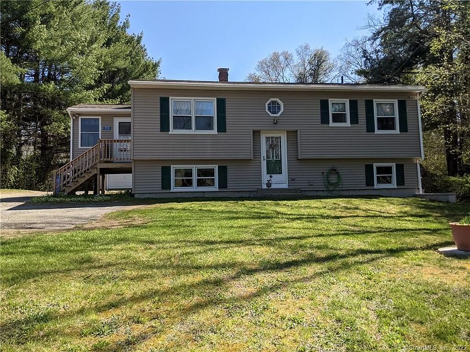 Dont miss out on this large raised ranch with 3 bedrooms and 1 bath at the end of the street in a charming and well established neighborhood. Step right into the main level through the insulated enclosed porch. Then walk into the kitchen with solid wood cabinets. The kitchen opens to the lovely dining area and living room. The main level also boasts 2 bedrooms, a full bath, plus a great room that includes beautiful wood peg floors, a woodstove, closet, bay windows, and sliders to the back deck. The lower level has a good size bedroom, family room, and laundry room. This property also includes a detached 2 car garage and a large back yard. Septic is only 4 years old and well pump is new. Close to Phaiahs Dog Park and the Quinebaug River Trail which provides almost 5 miles of scenic trails for biking and walking.