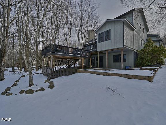 This 4 bedroom, 3.5 bath Golf Course home offers plenty of space and is located on the 8th Green in a four season amenity filled community in The Northern Poconos, just two hours from the NYC and Philadelphia Areas. There's a paved driveway, a large garage with a finished ''studio'' room above, easy access with just a few steps to enter the home, the master bedroom suite including a sitting area with access to the rear deck is on the main level. There's a beautiful new kitchen with quartz counter tops and soft close drawers, cathedral ceilings in the living room with fireplace and loft above. The walk out lower level has a finished lower level family room with built in shelving, a bedroom and a full bathroom. The outdoor space includes extensive decking and a gazebo.