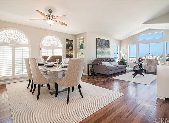 This home has been carefully prepared for the market with freshly painted interior combined with numerous custom upgrades including real wood flooring throughout, newly remodeled bathrooms along with an updated kitchen. Most importantly is the sweeping ocean views offered both inside the home as well as outside. Large ocean facing windows allow the ocean to be viewed in a " picture perfect" setting. The Additional views of the gentle rolling hills and night lighted homes are a plus! Additional features include a large ocean view balcony, private courtyard with manicured landscaping and stone covered steps leading to the custom front door. Upon viewing this home you will notice an impressive collection of selected quartzite surfaces on the counter tops which fully accent the Shaker Style cabinet doors and drawers. A master suite is separate and private with adjoining master bathroom featuring custom tiled workmanship plus a "Diamond finished" frameless shower surround. The home is perfectly positioned for ocean views and entertainment! Enjoy short walks to the beach as well as the local resorts at Monarch Beach.