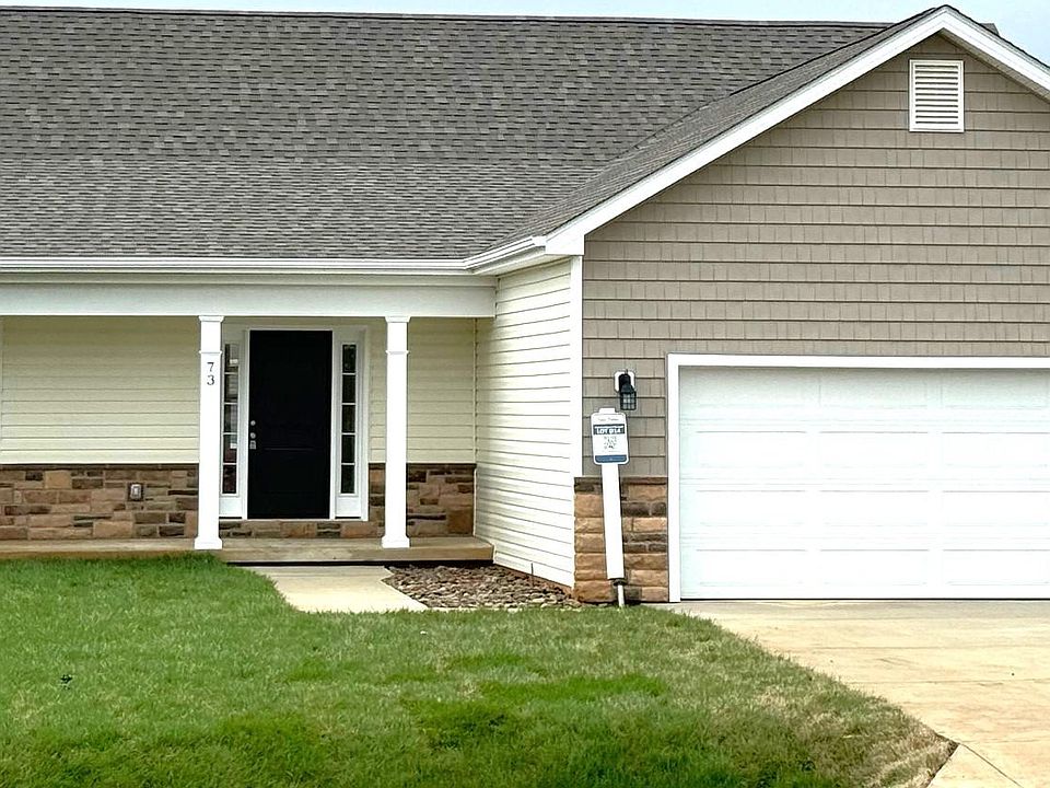 Nearly complete, 45 day delivery..... 1440 sqft Ranch Home featuring open floor plan design with vaulted ceiling in Family Room, LVP Flooring throughout main living areas, Kitchen with island, granite countertops, and stainless steel appliances, spacious family room, and large primary bedroom with tray ceiling and full bath w/ tile shower, bench seat, & glass shower door. Home has rear concrete patio, the front of the home has large front porch and stone water table. Home comes with 2-car garage with auto opener and concrete driveway. $10,000 close assist w use of preferred lenders