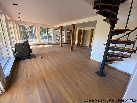 Stylish stone contemporary perched on a hillside with a detached garage with mini studio apartment space 2 Bedroom plus Den and 2 baths on 5.53 acres on a quiet country road. 864 sf on top floor plus SF basement - lots of contemporary in a quiet area - Copake Taconic Hills Schools Lots of great features, curved walls, stone fireplace, spiral staircase, hardwood floors, extra large stone retaining walls plus a lot more. Detached garage has a huge finished upstairs room with vaulted ceilings.