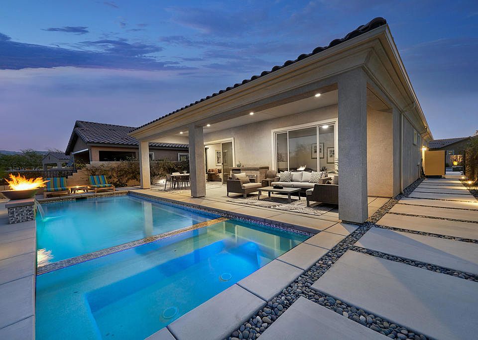 Impeccably maintained, this upgraded pristine residence in the popular community Del Webb Rancho Mirage offers a tranquil setting with a modern open-concept aesthetic. This desirable Solitude floor plan is perfect for the 55+ lifestyle. The current owner has also installed a large salt-water pool with decorative tile trim, waterfall, jacuzzi, and fire feature, enhancing the indoor/outdoor living experience. Additional features include: a striking chef's kitchen with large gathering island, stone countertops, custom backsplash, stainless steel appliances including a range hood, and a reverse osmosis + water softener system; a long, covered patio for alfresco dining and serving station with refrigerator; separate primary suite with pool views, an ensuite bathroom, and a large walk-in closet; a welcoming guest bedroom, an ideal office/den/guest overflow room option; remote-controlled window treatments in multiple areas; contemporary tile flooring; a concrete-coated garage floor, and a solar system to help reduce energy costs. Del Webb provides guard-gated security, tennis and pickleball courts, bocce ball courts, a clubhouse, a fully equipped fitness center, a massive community pool and spa, and more--all within close proximity to preferred shopping and dining destinations.