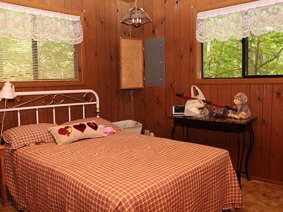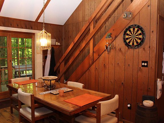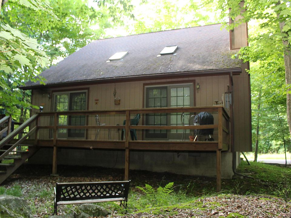 Country charm surrounds you in this well maintained 3 Bedroom, 2 Bath contemporary home. Real wood panelling, cathedral living area with skylights, and wood burning fireplace. The home is set on a quiet .38 ac lot, paved horseshoe driveway and deck facing the wooded views. Located in a four season recreational community with Private motor boating lake, golf course, ski hill, restaurants, indoor tennis, gym, game rooms, pools, beaches and much more!