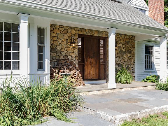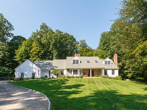 This classic New England Cape is situated off the beaten path, on a picturesque and private setting with 6 bedrooms and 5 baths. Quality construction and beautifully detailed, the home provides an extraordinary place to entertain with family and friends, and/or the perfect escape! The floor plan is spacious, while inviting, with a 2-story foyer, living room with large bay window & fireplace; library with custom built-ins and fireplace; professionally designed kitchen that opens to a large family room with fireplace and sliding glass doors leading to the outdoor stone patio; formal and casual dining areas; 1st floor master suite; a media/game room on second floor with 5 additional bedrooms, plus an expansive, lower level recreation room.