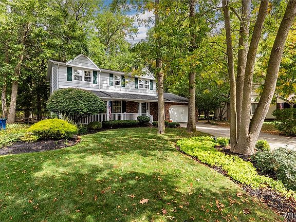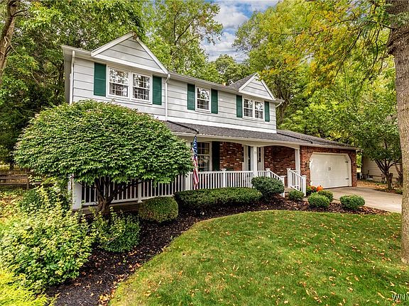 An inviting front porch welcomes you into this well maintained single owner Colonial home. Situated on a beautiful Cul de Sac in the Brush Creek Community, this 4 BR, 2.5 bath residence has a bright, thoughtful layout with generous living spaces. The sunlit living and dining rooms feature neutral carpeting and crown molding, setting a refined tone throughout the main level. The eat in kitchen shines with Brazilian cherry hardwood floors, white cabinetry, Silestone countertop and a tumbled tile backsplash. All appliances included. Adjacent to the kitchen is a spacious family room with built-in cabinetry, gas insert fireplace with brick surround, a wall of windows that flood the space with natural light, and a door that provides direct access to to the great back yard. A first floor laundry w/ stackable washer/dryer and a half bath complete the first level. The primary suite features his/her closets, neutral carpeting, a ceiling fan and a dedicated bathroom with a shower, vanity, and tile flooring. The secondary bedrooms are good sized, each with ample closet space and ceiling fans. The main bathroom boasts luxury vinyl plank flooring, vanity and new bath fitter shower. Outside, the fully fenced wooded private yard is complimented by a vinyl 10'x20' deck and a 10'x 20' Unilock patio with raised garden beds. The shed provides additional storage. Updates: Vinyl deck '23, Unilock patio '20, Underground sprinkler system in front yard '24, HWT '20, Sump pump w/ water gravity back up '20. Leaf filter gutters '20 ,Freshly painted interior '25. Washer/Dryer'22. Additional highlights: Glass block windows, Six panel doors through out, Water Softener system, Water filtration system and vinyl front porch railings. The home is conveniently located near schools, shopping and entertainment. Williamsville Schools. Offers will be reviewed as they come in.