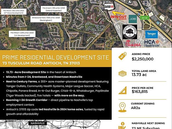 Prime +/-13.735 acre residential development opportunity in the heart of Antioch, just minutes from I-24, Brentwood, and Downtown Nashville. Situated next to Century Farms—a transformative 300+ acre master-planned development featuring Tanger Outlets, Community Health Systems, Major League Soccer, HCA, Chipotle, Panera Bread, In-N-Out Burger, Chick-fil-A, Whataburger, PopStroke (Tiger Woods backed), five hotels, and more on the way. Located in the booming I-24 growth corridor, this site offers direct access to Nashville’s major employment centers. Antioch’s 37013 zip code led all of Nashville in home sales in 2024, driven by rapid population growth and continued housing demand. (Two Parcel's ID#'s: 162 00 0 057.00 & 162 00 0 054.00).