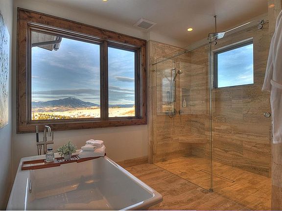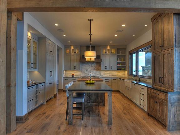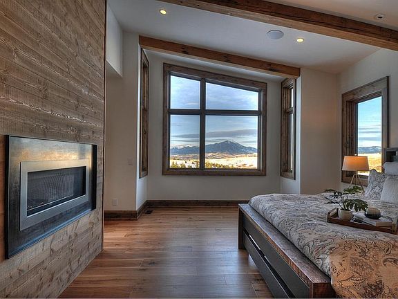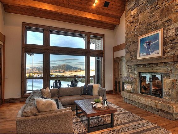 A breathtaking panorama of mountain and sky is captured in this 2017 home on 2.5 acres. Expansive Ipe decks, patios, glass walls and oversized windows create a seamless indoor-outdoor experience. The refined walnut floors pair well with reclaimed beams and barn-wood accents. Great room's extended skylight is a dramatic punctuation point to the dry-stack stone wood-burning fireplace. The kitchen is outfitted with a full range of professional grade Thermador appliances and its striking white cabinets contrast with the warm-tone soapstone counter tops. Great room, kitchen and dining anchor the center of the house with master bedroom & en-suite guest room flanking either side. Themes of serenity and subtle glamor are highlighted in master suite where stunning views from every direction are highlighted. Airy stairwell leads to walk-out lower level with large family room graced by a gas fireplace & wet bar. Two additional bedrooms, play-room, and full bath complete the guest arrangements.
