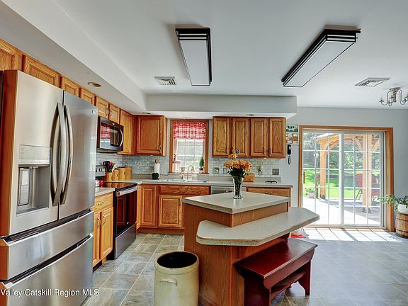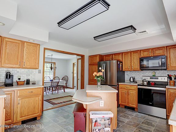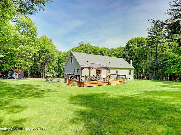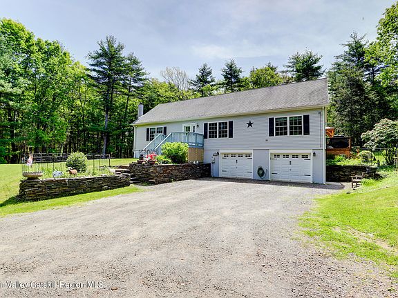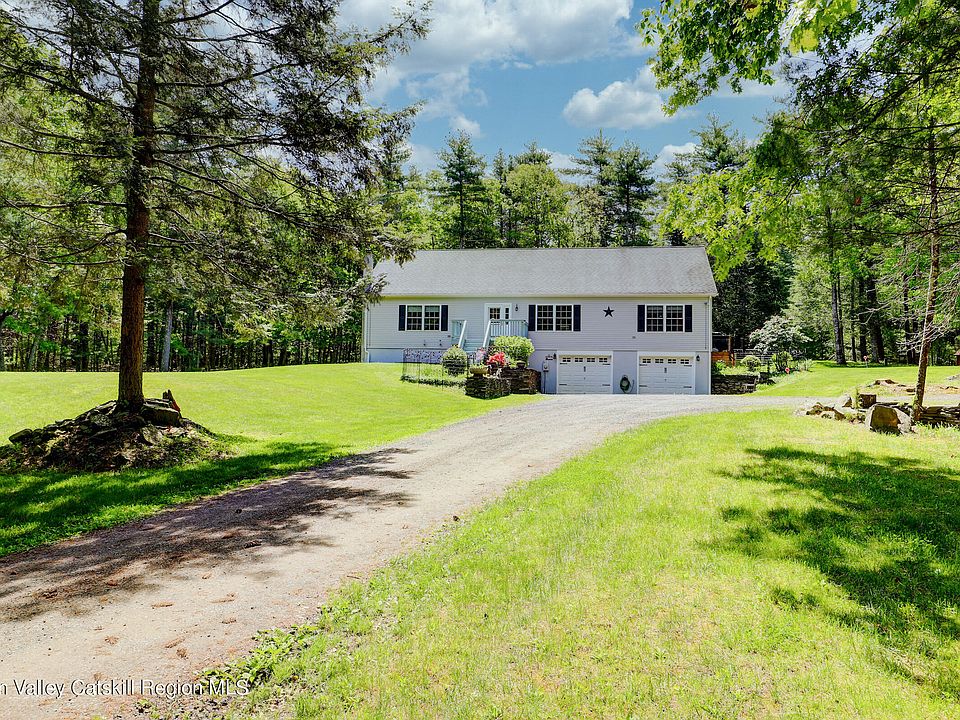 Welcome to your captivating sanctuary nestled in the stunning Hudson Valley. This delightful ranch, which has been meticulously maintained, is ideally situated on 2.51 private acres. It offers the ultimate in seclusion and tranquility, surrounded by attractive perennial gardens and mature trees. It is a calming environment perfect for summer BBQs on the expansive rear deck, complete with a gazebo, and cozy evenings around the fire pit. Upon entering this charming home, you are welcomed by a spacious and inviting living area. The eat-in kitchen flows effortlessly into the formal dining room and features a central island, brand-new stainless-steel appliances, and wooden cabinetry. The primary bedroom comes with an en-suite bathroom. Two additional bedrooms share a bathroom located on the opposite side of the home, ensuring privacy. The laundry room is conveniently situated on the main level. The finished basement, equipped with a wood-burning stove, is the perfect space for entertaining guests or for your own private sanctuary. The 960 sq. ft walk-up attic, currently used for storage, holds great potential for additional living space, with plumbing already in place for an extra bathroom. Additional amenities include central air, a freshly painted interior, new carpeting and lighting fixtures, a two-car attached garage, and a shed. This secluded haven is conveniently located just a short 10-minute drive from the charming town of Stone Ridge and the picturesque Ashokan Reservoir. It offers easy access to popular nearby attractions including Inness Golf Course, Arrowood Farm Brewery, Westwind Orchard & Cidery, Kelder's Farm, Mohonk Mountain House, and Minnewaska State Park for hiking and biking. It is only 90 minutes from Metro NY. Dive into the idyllic charm of country living with this stunning gem!