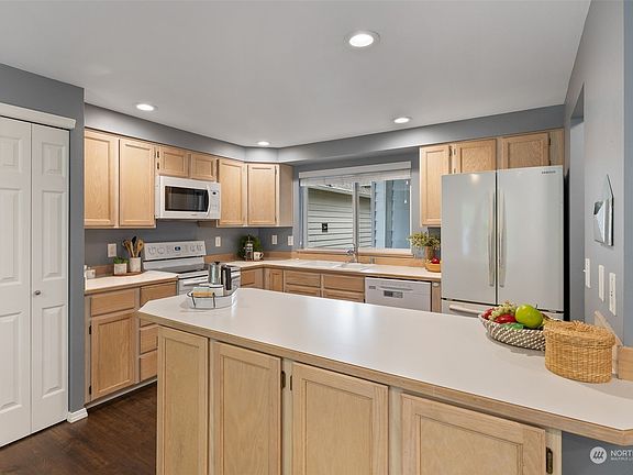 Welcome to Desirable Kiley Court! Beautiful 3 Bedroom 2.5 Bath 2-story condo w/updated engineered hardwood floor on main floor with new carpet on stairs and 2nd floor. Nice sized primary bedroom w/ full en-suite, plus 2 large additional bedrooms + washer & dryer also situated upstairs for easy access. The spacious downstairs boasts a bright kitchen w/breakfast bar, open living space, gas fireplace, updated half bath & south facing private concrete patio. Additional feature in family & dining room w/walls upgraded to isolate sound transmission between adjacent units. 2 car garage w/2 additional spots + sports court and park area in center of complex. New roof installed in 2019! Easy access to I-5, Boeing, Paine Field, & Costco. Strong HOA!
