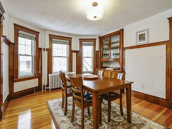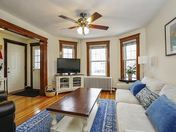 Desirable Adams Village two bedroom, one and a half bath condo loaded with character and charm! Bright and sunny open concept living/dining room with high ceilings, built-in hutch and custom window treatments. Gorgeous refinished hardwood floors throughout. Spacious updated kitchen with stainless steel appliances, new dishwasher 2019, new microwave 2020 washer and dryer 2018 new roof 2017. Front and back porches and half bath with in-unit washer/dryer. Ample basement storage. This fantastic location is convenient to neighborhood shops, public transportation and Rte. 93.