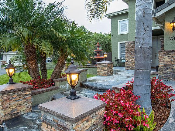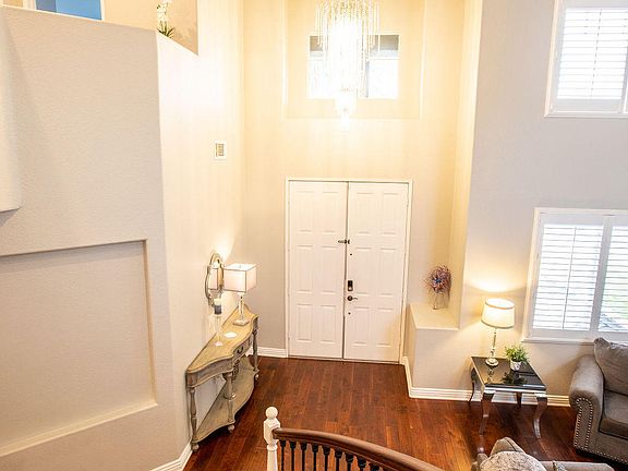 This home shows with such finesse. Corner lot,4 bedrooms and 3 baths,1,906 sq ft of living space and sits on a lot of 7,159 sq ft.The exterior has custom paint, stamped concrete entry way steps and driveway, the front yard landscape has been beautifully maintained with a Caterina fountain with basin. Upon entering you will notice the high ceilings, entryway crystal chandelier, hardwood floors and a wrought iron and curved staircase. Crown molding and Plantation shutters throughout.The Smart Home controlled AC and Heating system is less than a year old. Kitchen has over $12k in new kitchen appliances along with a water softener system.Dining room has a gas burning fireplace! High-end carpet and padding in all the bedrooms.The first-floor bedroom is perfect for guests or an office and a full bath. Bathrooms have custom granite tiled, featuring high end vanities and crystal lighting with tiled backsplashes. Backyard is very spacious with stamped concrete, covered patio, built in BBQ area with a sink and built in gas fire pit. RV access with various fruit trees along the property which gives additional privacy.Home has a high-tech Vivint Security. 3 car attached garage has been fully insulated, shear walled for extra support. LED lighting and epoxy flooring.