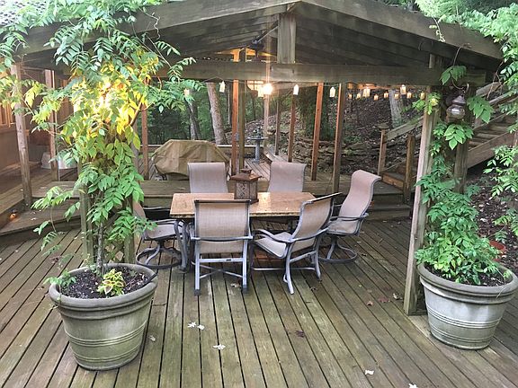 Retreat all year round in this luxurious FULLY FURNISHED, lake home. MOVE IN READY! Lake views from every room! Features large open kitchen, living, and dining room area. Beautiful granite countertops, slate floors, high end appliances, two fireplaces, large wood windows and doors, built-ins, walk in closet, security system, and tons of additional storage. Finished lower level that walks out towards the lake, with three additional bedrooms, full bath and living/dining room. Enjoy 980 feet of shoreline, 2 slip PRIVATE boat dock with boat and jet ski lifts. Attached two car garage with two additional 12x16 detached buildings, and lots of entertainment space both indoor and out. A huge 3 story cliff boarders the property, making this location one of a kind! This gem is a must see!!